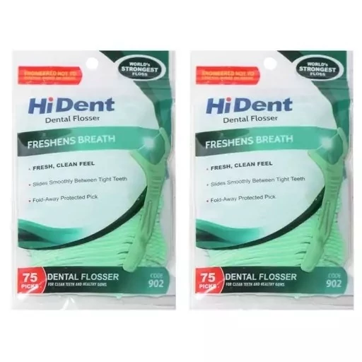 بسته دو عددی نخ دندان کمانی هایدنت همراه خلال دندان هر بسته شامل 75 عدد نخ دندان کمانی است .