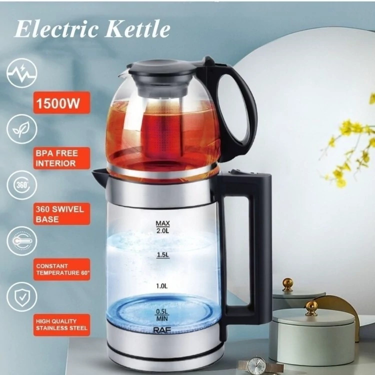 توان مصرفی 1500 وات ظرفت کتری 2 لیتر ظرفیت قوری 0.8 لیتر جنس بدنه استیل و شیشه خاموش شدن خودکار دارد